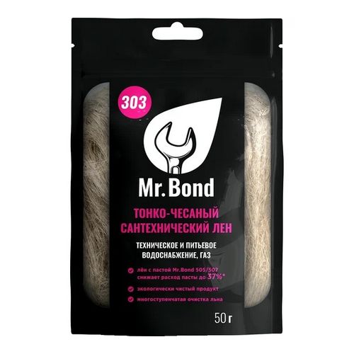 Лен сантехнический Mr.Bond 303 представляет собой чистый натуральный продукт, изготовленный из тонкого, однородного, длинноволокнистого, чёсаного льна, получаемого из стебля льна. Изготовлен по ГОСТ Р 53549-2009.