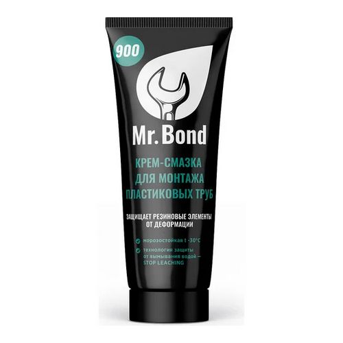 Крем-смазка для монтажа пластиковых труб Mr.Bond 900 предотвращает деформацию и пересыхание резиновых прокладок. Продукт подходит для ремонтных работ как внутри, так и снаружи помещений и выдерживает низкие температуры до -30°С.